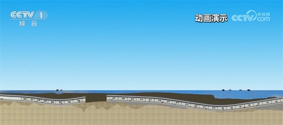 總臺(tái)央視記者 李偉代:我身后就是深中通道西人工島,它是深中通道橋隧轉(zhuǎn)換的關(guān)鍵構(gòu)造;從這里開始,深中通道將從橋梁部分轉(zhuǎn)入全長(zhǎng)6845米海底隧道部分,未來汽車將從這里駛?cè)牒5姿淼溃钌顚⒃诤5?0米的沉管中行駛。