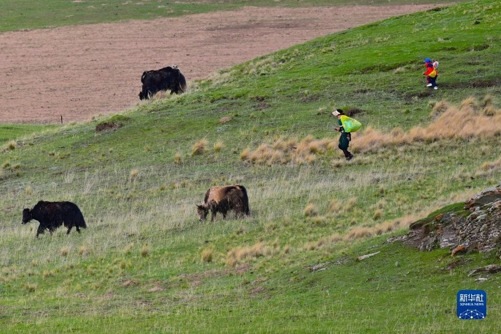 6月9日,在青海省黃南藏族自治州澤庫縣的高原草原上,當地牧民在放牧。