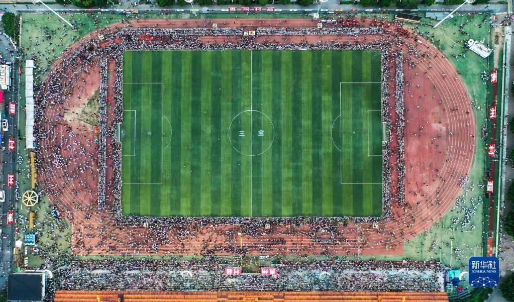 6月9日,人們?cè)谟^看鳳凰村隊(duì)與新中村隊(duì)的“村超”足球比賽。