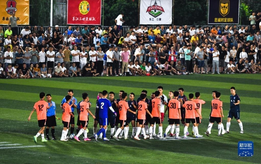6月9日,鳳凰村足球隊(duì)與新中村足球隊(duì)在比賽結(jié)束后相互擊掌致意。