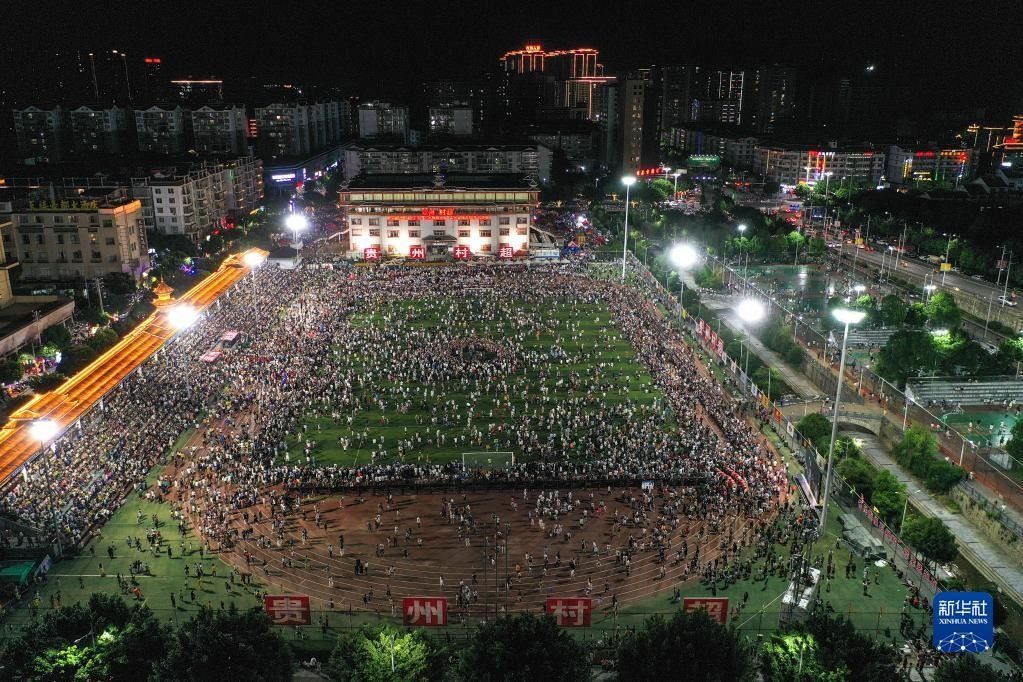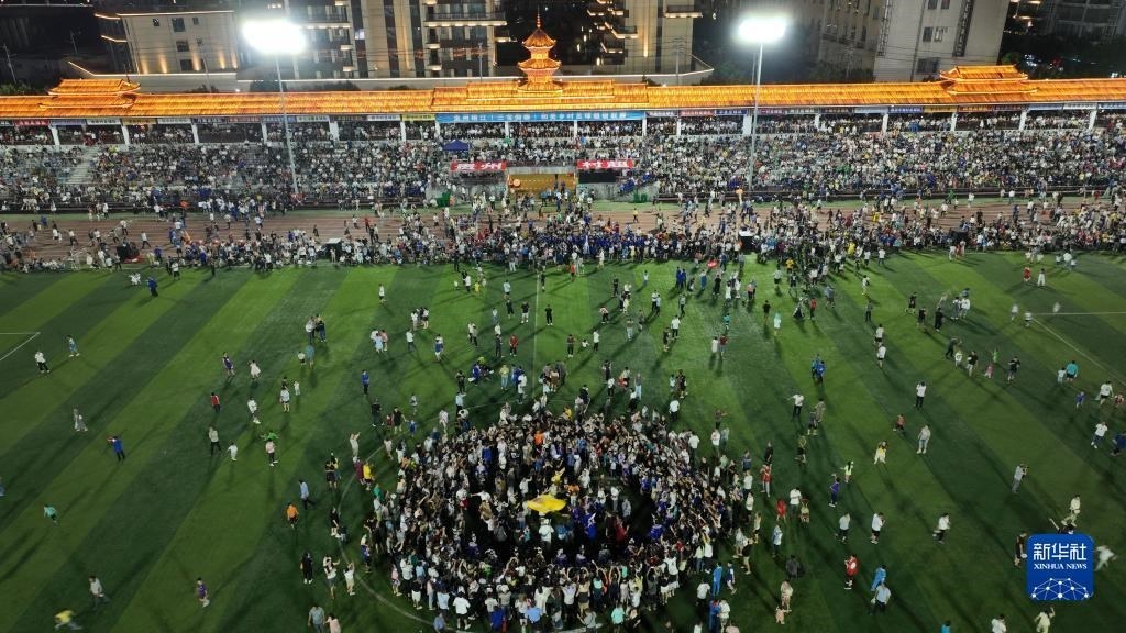 6月10日,演員在貴州“村超”足球比賽后表演民族舞蹈“多耶”,現(xiàn)場(chǎng)觀眾一起上場(chǎng)狂歡(無(wú)人機(jī)照片)。