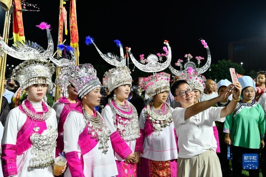 6月9日,一名游客在貴州“村超”足球比賽現(xiàn)場(chǎng)與少數(shù)民族拉拉隊(duì)合影。