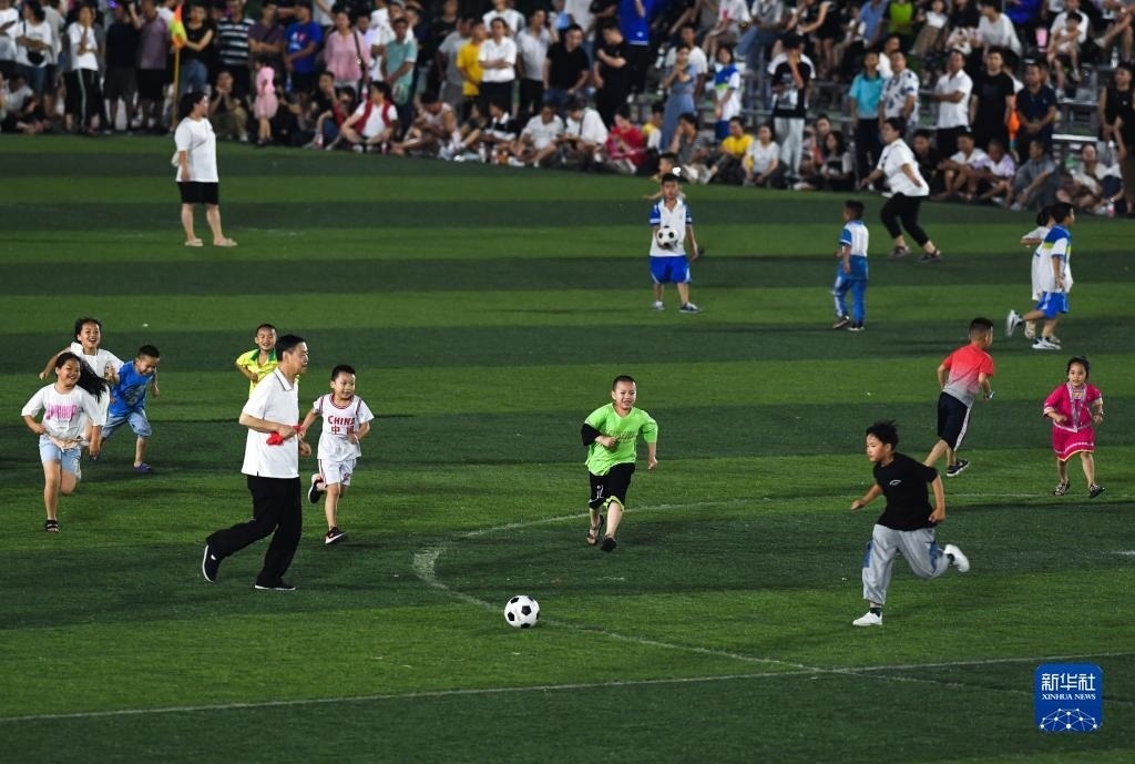 6月9日,小朋友們?cè)谫F州“村超”足球比賽半場(chǎng)休息時(shí)間上場(chǎng)踢球。