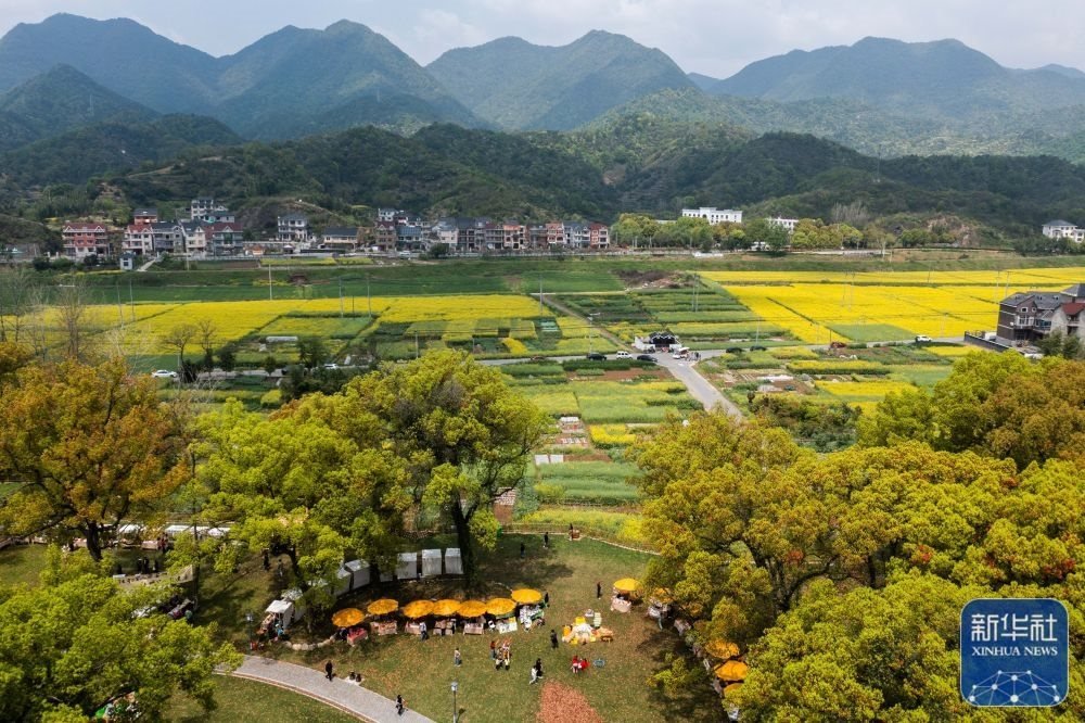 空中俯瞰浙江杭州市富陽區(qū)新桐鄉(xiāng)小桐洲村香樟公園和盛開的油菜花田(4月7日攝,無人機(jī)照片)。新桐鄉(xiāng)依托近萬畝盛開的油菜花田和美麗的富春江風(fēng)景,開展特色鄉(xiāng)村文旅活動(dòng),做好美麗鄉(xiāng)村、美麗經(jīng)濟(jì)的文章,助力鄉(xiāng)村振興。新華社記者 徐昱 攝