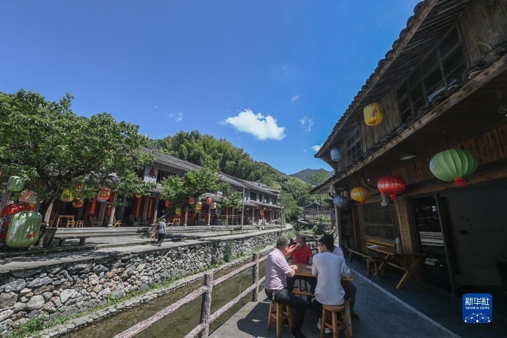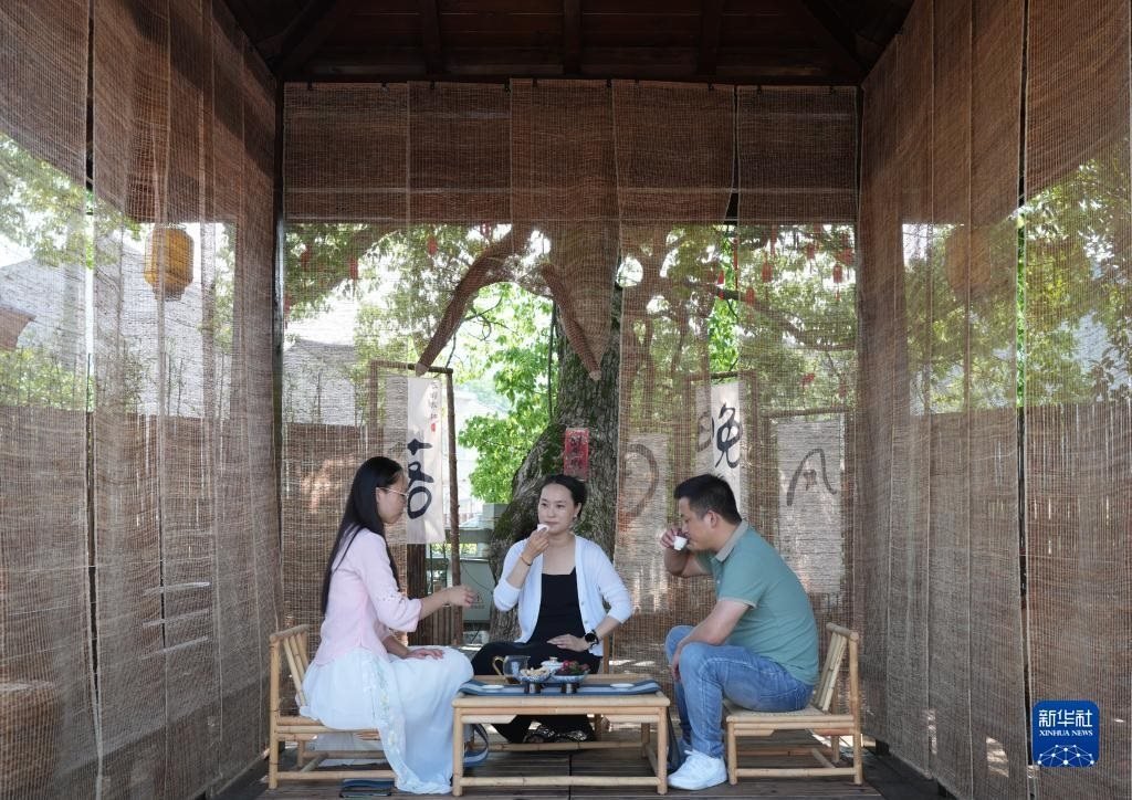 人們?cè)谡憬_(tái)州黃巖區(qū)嶼頭鄉(xiāng)布袋坑村的溪水旁喝茶(5月30日攝)。近年來,嶼頭鄉(xiāng)堅(jiān)持黨建引領(lǐng),以全域旅游和美麗鄉(xiāng)村建設(shè)為重要抓手,引進(jìn)文化創(chuàng)意團(tuán)隊(duì),為鄉(xiāng)村旅游注入更加年輕化的元素,推進(jìn)特色民宿以及布袋山饅頭、溪坑魚等農(nóng)特產(chǎn)品的發(fā)展,帶動(dòng)鄉(xiāng)村振興和百姓共富。新華社記者 徐昱 攝