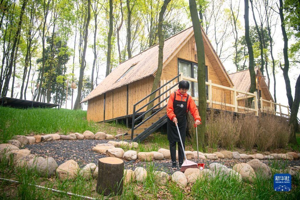浙江諸暨楓橋鎮(zhèn)陽春村村民在一家度假村內(nèi)工作(3月29日攝)。當(dāng)?shù)赝ㄟ^閑置荒山土地流轉(zhuǎn)發(fā)展鄉(xiāng)村旅游,幫助陽春村60名村民實(shí)現(xiàn)在家門口就業(yè)增收。新華社記者 黃宗治 攝