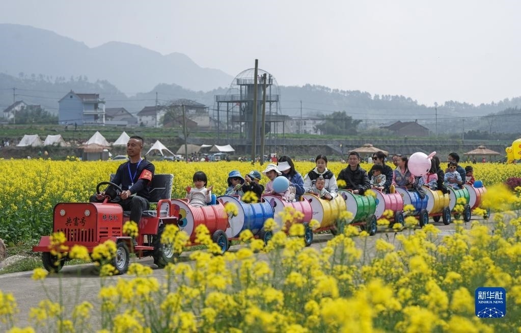 在浙江杭州臨安區(qū)青山湖街道郎家村“共富稻田”,游客乘坐田野小火車在油菜花地里感受春日美景(4月1日攝)?!肮哺坏咎铩倍ㄎ欢喙δ芴飯@農(nóng)旅綜合體,陸續(xù)打造了妙哉花園、稻田觀光道、稻田餐廳、稻田茶吧等鄉(xiāng)村旅游特色節(jié)點(diǎn),吸引城市居民前來體驗(yàn)戶外農(nóng)田生活。新華社記者 徐昱 攝