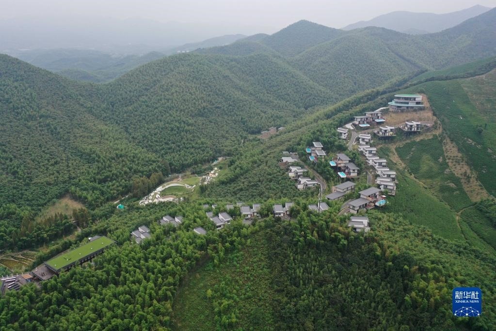 位于浙江湖州吳興區(qū)妙西鎮(zhèn)的“慧心谷”度假酒店(無人機(jī)照片,2020年10月3日攝)。附近妙山村的不少村民在這家山谷中的酒店就業(yè)。新華社記者 黃宗治 攝