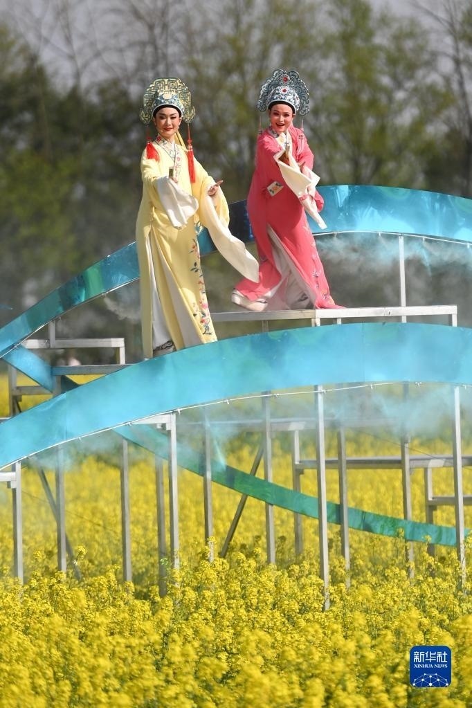 越劇演員在浙江桐廬梅蓉村油菜花田里的舞臺(tái)上表演(3月26日攝)。新華社記者 黃宗治 攝