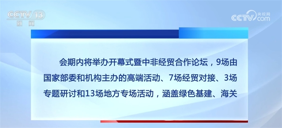 會(huì)期內(nèi)將舉辦開幕式暨中非經(jīng)貿(mào)合作論壇,9場(chǎng)由國(guó)家部委和機(jī)構(gòu)主辦的高端活動(dòng)、7場(chǎng)經(jīng)貿(mào)對(duì)接、3場(chǎng)專題研討和13場(chǎng)地方專場(chǎng)活動(dòng),涵蓋綠色基建、海關(guān)檢疫、醫(yī)藥衛(wèi)生、農(nóng)食產(chǎn)品、輕工紡織、產(chǎn)業(yè)園區(qū)、婦女青年、職業(yè)教育等領(lǐng)域,還將發(fā)布《中非經(jīng)貿(mào)關(guān)系報(bào)告》、中非貿(mào)易指數(shù)等近20項(xiàng)成果。
