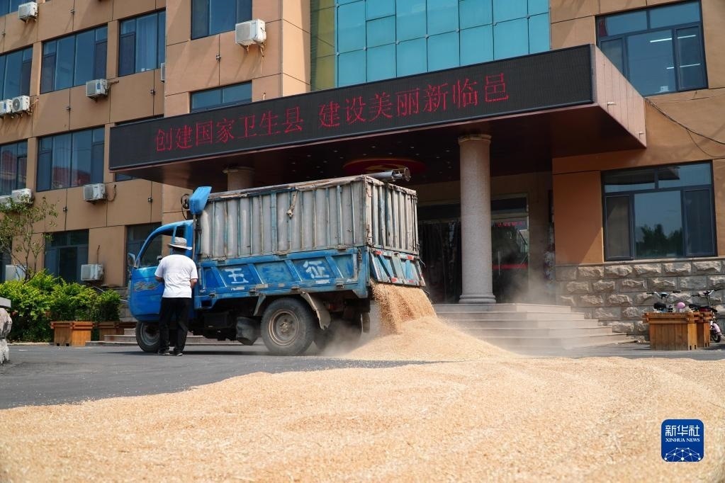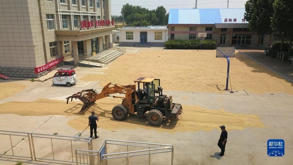 6月13日,農戶在臨邑縣臨盤街道政府大院曬糧。