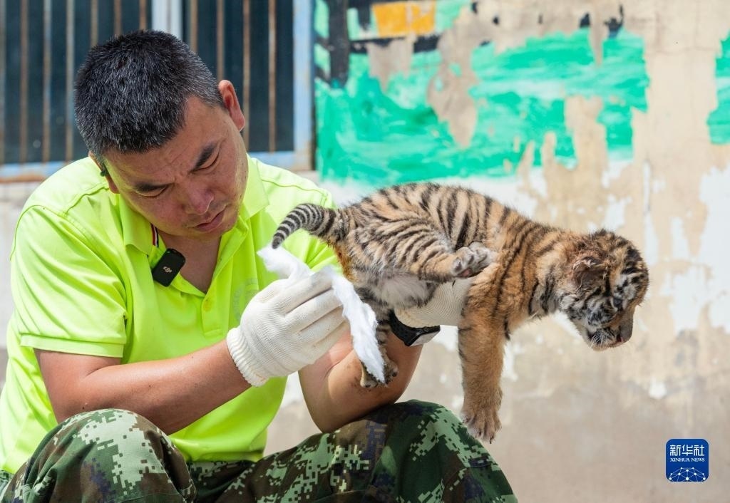 6月13日,在黑龍江東北虎林園的虎舍中,飼養(yǎng)員給東北虎幼崽測量體溫。