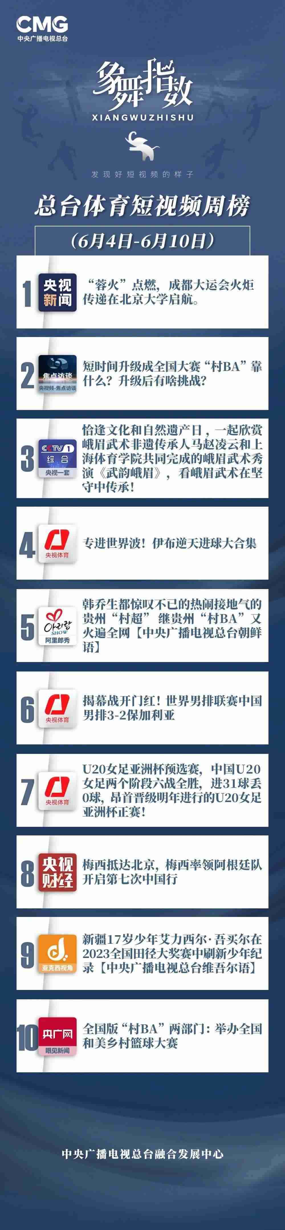 中央廣播電視總臺“象舞指數(shù)”評議品牌,推出體育短視頻周榜、總臺體育短視頻周榜。在6月4日—6月10日,以下內(nèi)容獲得矚目: