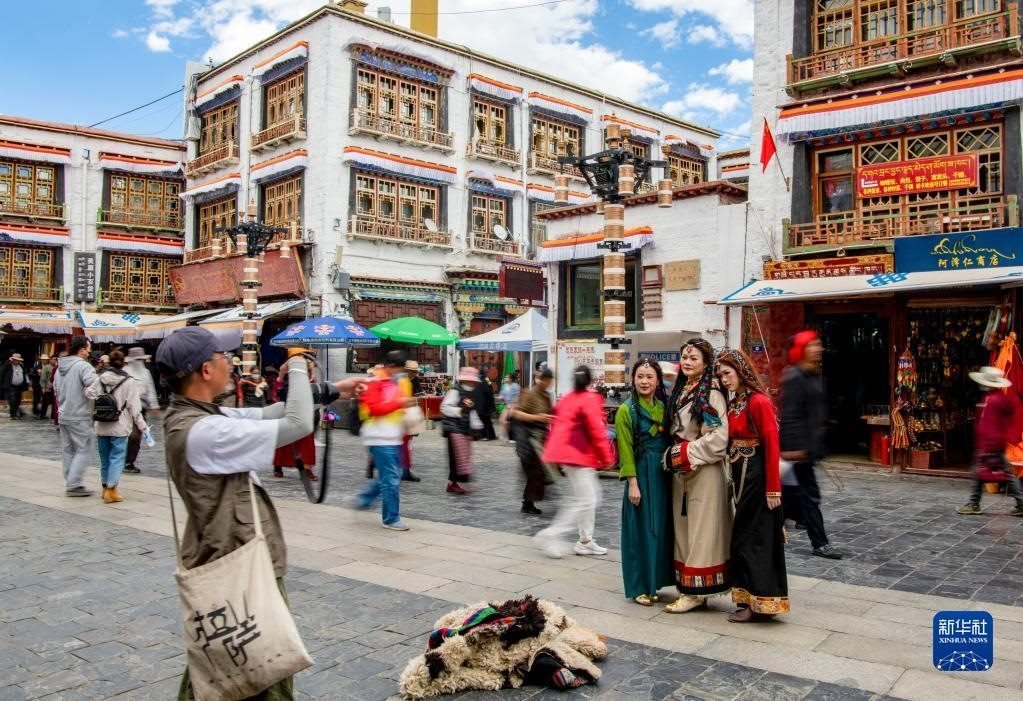 游客身著藏裝在八廓街拍照留念(6月13日攝)。