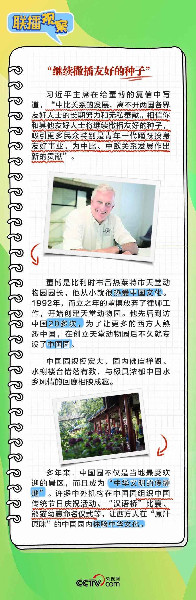 董博是比利時(shí)布呂熱萊特市天堂動(dòng)物園園長(zhǎng),他在給習(xí)主席致信中回顧了習(xí)主席和夫人彭麗媛2014年3月訪比期間出席天堂動(dòng)物園大熊貓園開(kāi)園儀式的情景,表示中國(guó)園體現(xiàn)人與自然和諧共生理念,中國(guó)夢(mèng)和中國(guó)的發(fā)展繁榮永遠(yuǎn)是可共享的機(jī)遇。