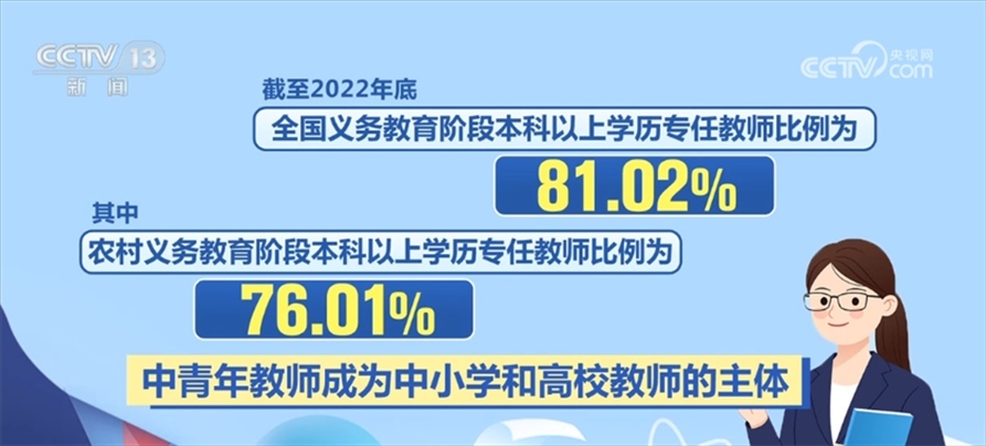 近年來(lái),“特崗計(jì)劃”、“三區(qū)”人才支持計(jì)劃教師專項(xiàng)計(jì)劃等源源不斷地為鄉(xiāng)村學(xué)校補(bǔ)充高素質(zhì)教師。優(yōu)師計(jì)劃、師范教育協(xié)同提質(zhì)計(jì)劃、國(guó)優(yōu)計(jì)劃等的實(shí)施,也在助力優(yōu)秀教師的培養(yǎng)。我國(guó)各級(jí)各類(lèi)教師隊(duì)伍學(xué)歷不斷提高、年齡結(jié)構(gòu)不斷優(yōu)化。截至2022年底,全國(guó)義務(wù)教育階段本科以上學(xué)歷專任教師比例為81.02%,其中,農(nóng)村義務(wù)教育階段本科以上學(xué)歷專任教師比例為76.01%,中青年教師成為中小學(xué)和高校教師的主體。