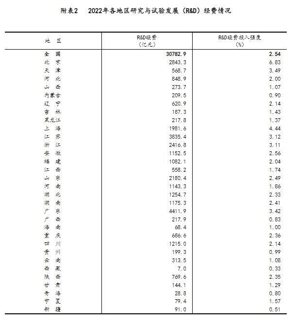 2022年,全國(guó)共投入研究與試驗(yàn)發(fā)展(R&D)經(jīng)費(fèi)30782.9億元,比上年增加2826.6億元,增長(zhǎng)10.1%;研究與試驗(yàn)發(fā)展(R&D)經(jīng)費(fèi)投入強(qiáng)度(與國(guó)內(nèi)生產(chǎn)總值[2]之比)為2.54%,比上年提高0.11個(gè)百分點(diǎn)[3]。按研究與試驗(yàn)發(fā)展(R&D)人員全時(shí)工作量計(jì)算的人均經(jīng)費(fèi)為48.4萬(wàn)元,比上年下降0.5萬(wàn)元。