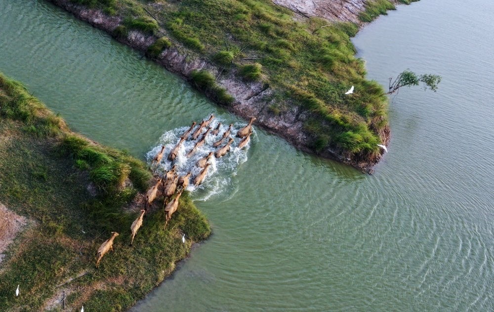 一群麋鹿在江蘇大豐麋鹿國家級自然保護區(qū)野鹿蕩渡河(無人機照片,8月20日攝)。