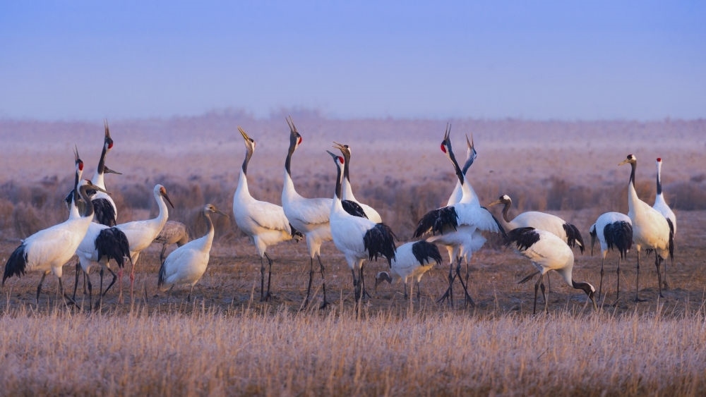 丹頂鶴等棲息在江蘇鹽城濕地珍禽國家級自然保護區(qū)。