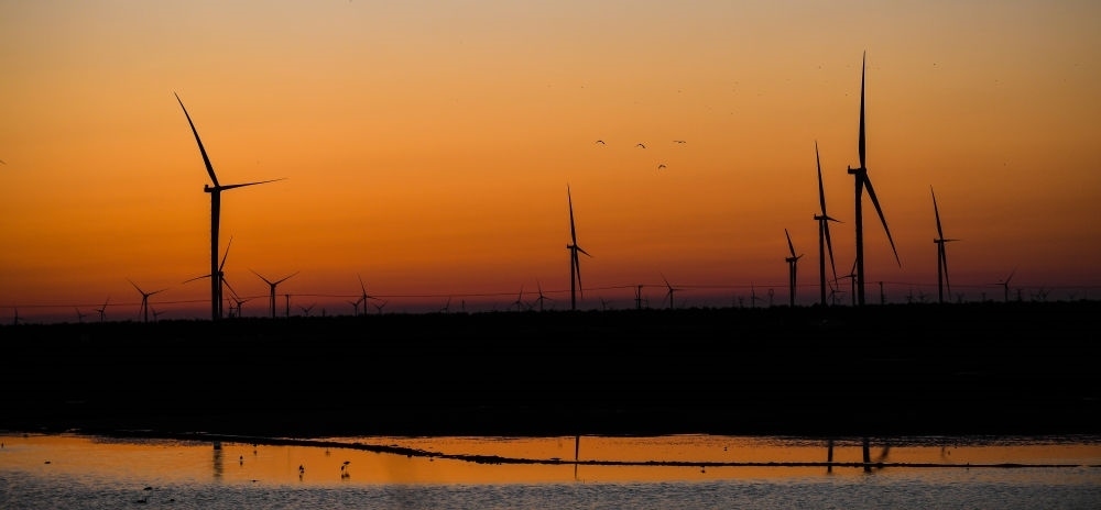 落日時分拍攝的東臺沿海經(jīng)濟區(qū)風力發(fā)電機組(無人機照片,8月31日攝)。