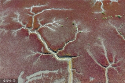 遼寧盤錦,大洼區(qū)紅海灘的潮溝與堿蓬草編織成一幅迷人圖案。