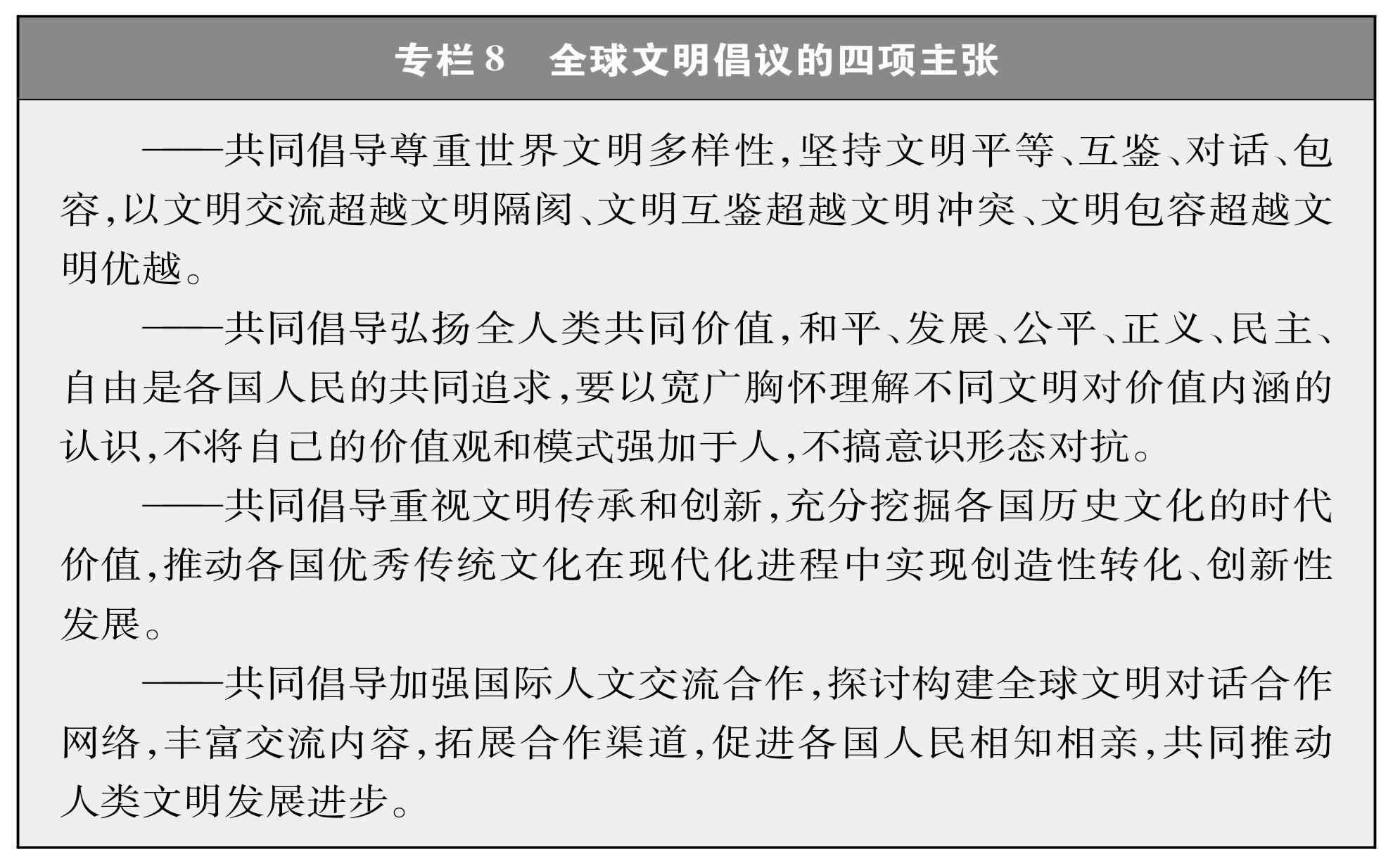 ——中國提出全球文明倡議,共同倡導(dǎo)尊重世界文明多樣性,共同倡導(dǎo)弘揚全人類共同價值,共同倡導(dǎo)重視文明傳承和創(chuàng)新,共同倡導(dǎo)加強國際人文交流合作。全球文明倡議向全世界發(fā)出增進(jìn)文明交流對話、在包容互鑒中促進(jìn)人類文明進(jìn)步的真摯呼吁,為推動構(gòu)建人類命運共同體注入了精神動力。