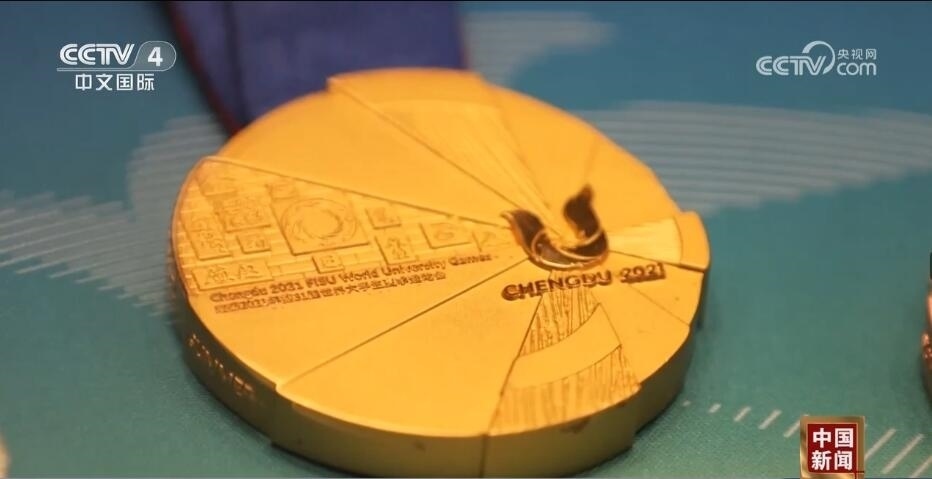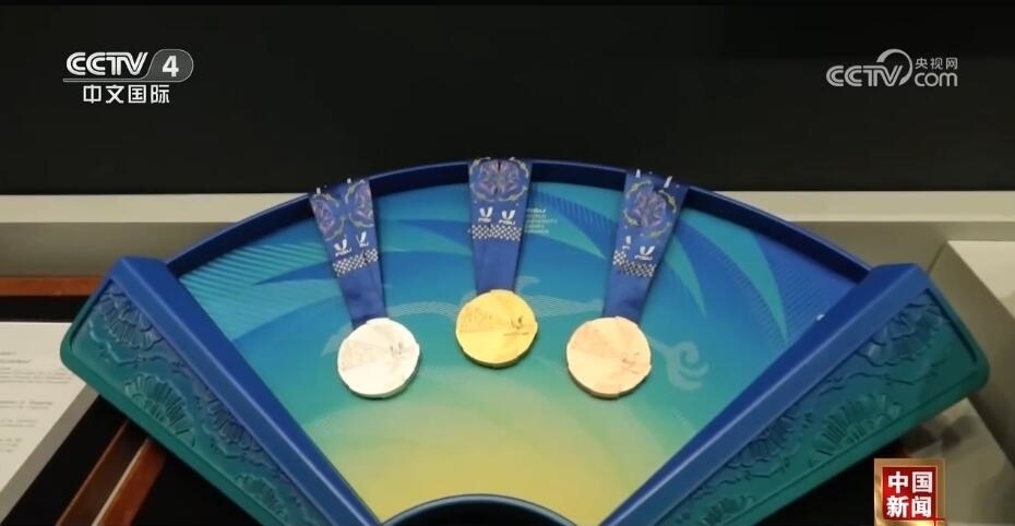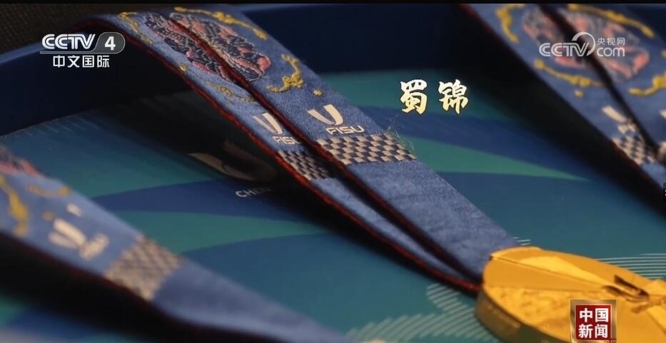 總臺(tái)記者 王豐:走進(jìn)成都大運(yùn)會(huì)博物館,最大的感受就是成都的元素?zé)o處不在。比如,我們剛一進(jìn)來(lái),右手邊是成都大運(yùn)會(huì)的吉祥物蓉寶??赐耆貙殠鷣?lái)看看蓉光,什么是蓉光呢?獎(jiǎng)牌代表了成都大運(yùn)會(huì)的榮譽(yù),“蓉”是取自成都的簡(jiǎn)稱,包含了光榮和融合的含義,整個(gè)獎(jiǎng)牌的設(shè)計(jì)是呈現(xiàn)了不規(guī)則的圓形。另外,獎(jiǎng)牌的元素包含成都市的標(biāo)志——太陽(yáng)神鳥(niǎo)。此外,在獎(jiǎng)牌的綬帶設(shè)計(jì)上首次采用了蜀錦的制作工藝,實(shí)際上也是非物質(zhì)文化遺產(chǎn)活化利用的非常好的案例。