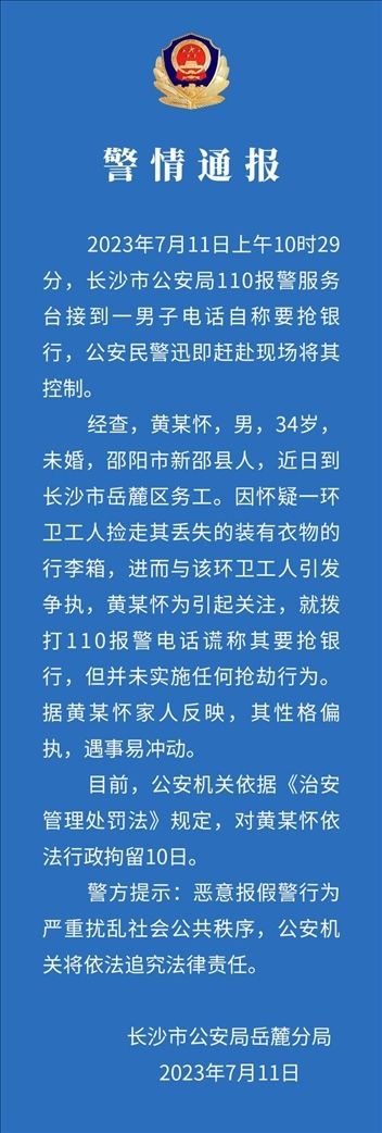 ·一人因與環(huán)衛(wèi)工人引發(fā)爭執(zhí),為引起關注,撥打110報警電話謊稱要搶銀行。長沙警方通報,對其依法行政拘留10日。