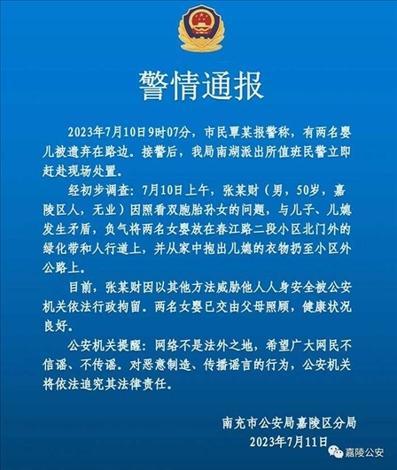 ·網(wǎng)傳“老人當街遺棄雙胞胎女嬰”,警方:系負氣而為,已行拘。