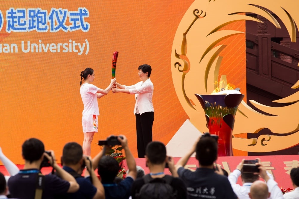 7月2日,第一棒火炬手吳敏霞(左)接過點燃的火炬。當日,成都第31屆世界大學生夏季運動會火炬?zhèn)鬟f成都站起跑儀式在四川大學校園內舉行。新華社發(fā)(曹鵬攝)