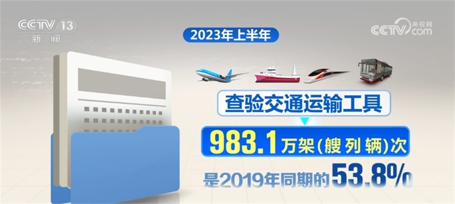 據(jù)國家移民管理局統(tǒng)計,2023年上半年,全國移民管理機構共查驗出入境人員1.68億人次,是2019年同期的48.8%,其中內地居民8027.6萬人次,港澳臺居民7490.3萬人次,外國人843.8萬人次(不含邊民);查驗交通運輸工具983.1萬架(艘、列、輛)次,是2019年同期的53.8%,其中,飛機20.4萬架次、船舶19.1萬艘次、火車4.4萬列次、汽車939.2萬輛次。