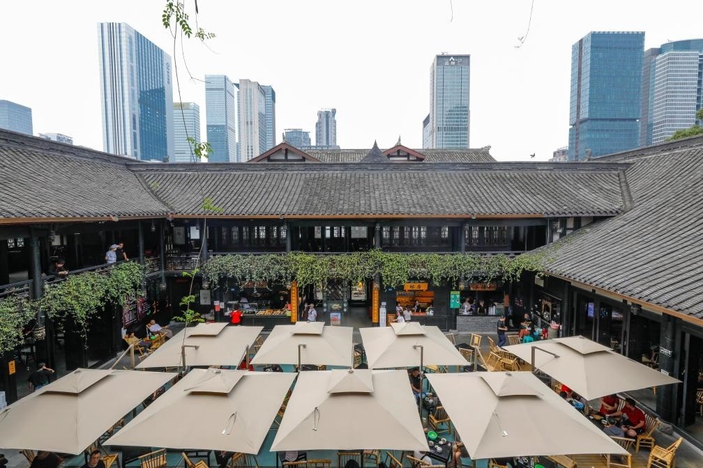 人們?cè)诔啥继爬锎蟠人聝?nèi)的茶社喝茶、休閑,不遠(yuǎn)處高樓林立