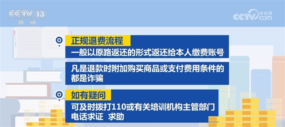 正規(guī)退費(fèi)流程一般以原路返還的形式返還給本人繳費(fèi)賬號,凡是退款時附加購買商品或支付費(fèi)用條件的都是詐騙。如有疑問,可及時撥打110或有關(guān)培訓(xùn)機(jī)構(gòu)主管部門電話求證、求助。