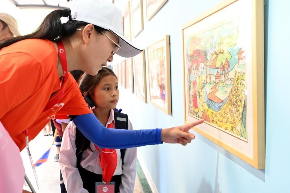 △2023年5月24日,乘坐中老鐵路國際旅客列車的百名老撾學生抵達中國云南西雙版納,和中國學生開展聯(lián)誼活動。圖為志愿者向老撾學生講解允景洪小學內(nèi)展出的學生畫作。