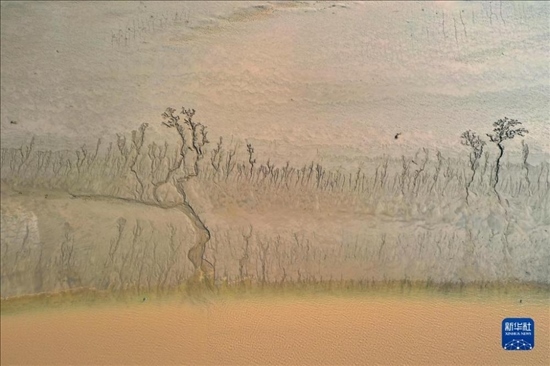 近日,隨著黃河調(diào)水調(diào)沙結(jié)束,黃河河南省開封市黑崗口險(xiǎn)工段水位下降。河床被水流沖刷過后呈現(xiàn)出縱橫交錯(cuò)的“脈絡(luò)”。