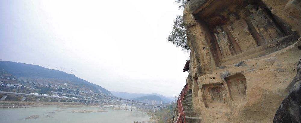 值得關(guān)注的是,就在千佛崖的河對(duì)岸,幾條現(xiàn)代化交通網(wǎng)錯(cuò)落有致地交織在一起。今日的廣元是名副其實(shí)的“交通博物館”。老川陜路、京昆高速、寶成鐵路、西成高鐵、嘉陵江航道在這里交織“奔騰”。橫渡嘉陵江,仿佛穿越古今。