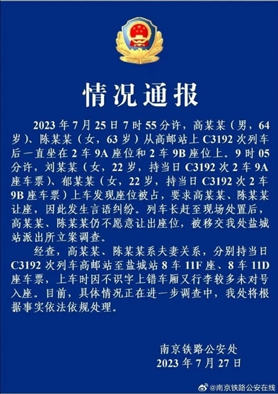 ·兩老人高鐵霸座反罵買票人不要臉,南京警方通報已立案調(diào)查。
