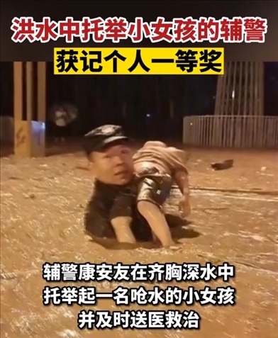 近日,四川瀘州古藺遭遇暴雨洪災(zāi)多人被困。輔警康安友在齊胸深水中托舉起一名嗆水的小女孩,并及時(shí)送醫(yī)救治。7月29日,康安友獲記個(gè)人一等獎(jiǎng)。