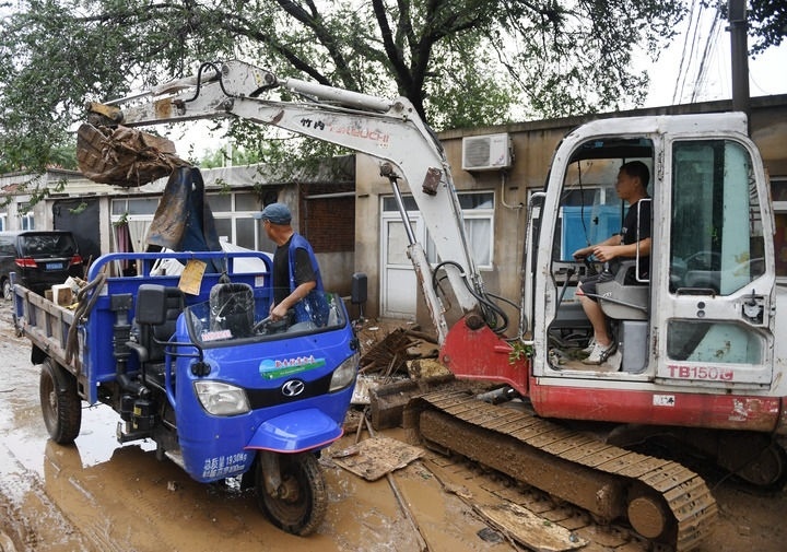 7月31日,在河北省石家莊市井陘縣307國道長崗村段,防汛工作人員駕駛機械清理淤泥。新華社發(fā)(梁子棟攝)