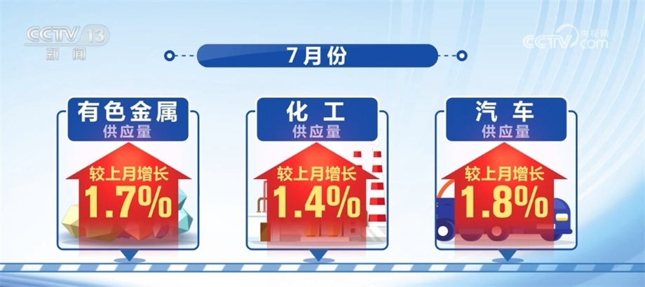 7月份,鋼鐵、煤炭和成品油供應(yīng)量較上月分別增加4.6%、7.3%和4.1%,增速較上月分別加快1.4、1.1和1.3個(gè)百分點(diǎn)。有色金屬、化工和汽車供應(yīng)量較上月分別增長(zhǎng)1.7%、1.4%和1.8%。
