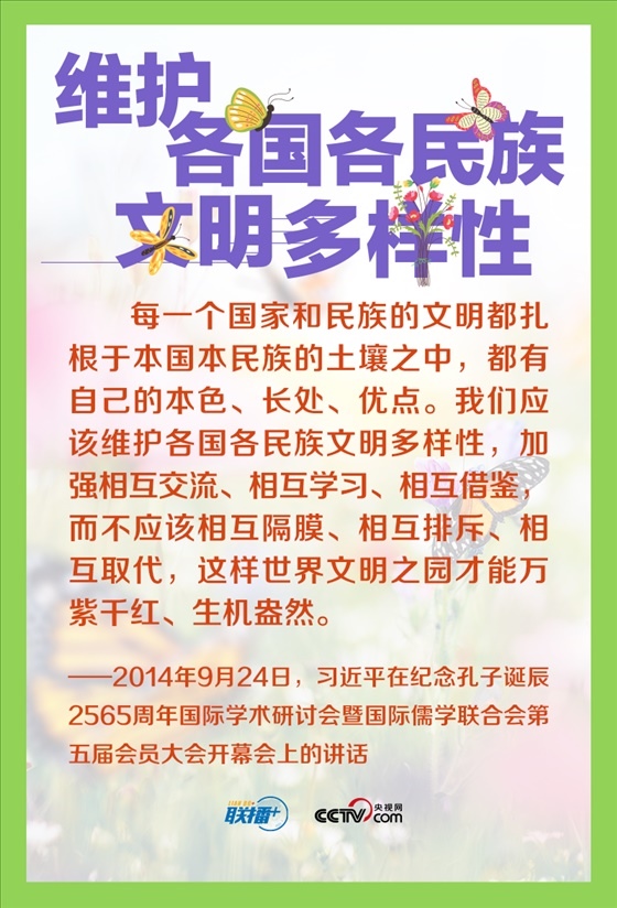 人類文明多樣性賦予這個世界姹紫嫣紅的色彩,多樣帶來交流,交流孕育融合,融合產(chǎn)生進步。長期以來,習近平主席在不同場合多次倡導尊重世界文明多樣性,推動不同文明交流對話、和平共處、和諧共生。讓我們一起來學習。