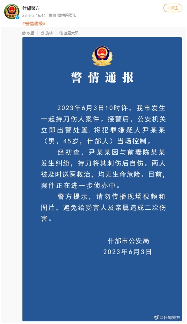四川什邡警方通報(bào)一起持刀傷人案件:嫌煩因與前妻發(fā)生糾紛,持刀將其刺傷后自傷 川什邡市公安局發(fā)布警情通報(bào),6月3日10時(shí)許,什邡市發(fā)......