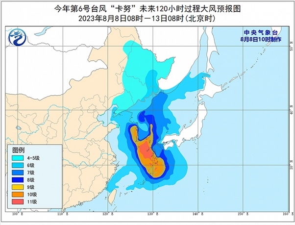 預(yù)計今年第6號臺風(fēng)“卡努”將以每小時10公里左右的速度向北移動,強度將有所增強,8月10日上午將在韓國南部沿海登陸,預(yù)計登陸時強度為強熱帶風(fēng)暴級或臺風(fēng)級(28~33米/秒,10~12級),11日夜間進入我國東北地區(qū)境內(nèi),并逐漸減弱變性為溫帶氣旋。