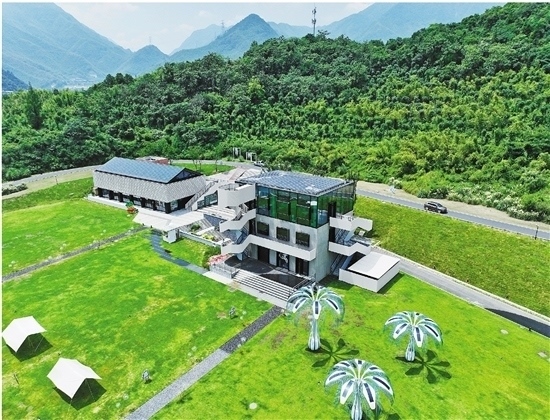圖為余村未來圖書館,該建筑主要通過鋪設(shè)在屋頂上的光伏發(fā)電系統(tǒng)和“光伏樹”供電(無人機(jī)照片)。新華社記者 翁忻旸 攝
