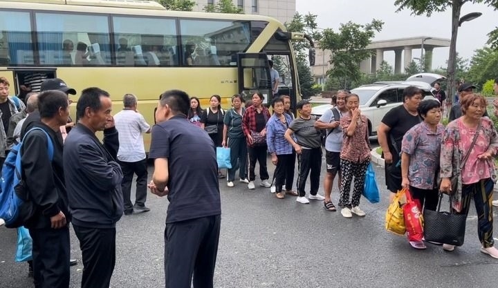 “不著急,慢點兒下,咱這兒有住的、有吃的?!眮碜晕宄J忻駱粪l(xiāng)的群眾陸續(xù)走下大巴車,已有工作人員等在車前。