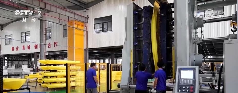 在浙江慈溪的一家皮劃艇企業(yè),記者看到,一條皮劃艇的吹塑生產(chǎn)線正在運(yùn)轉(zhuǎn)。和傳統(tǒng)的滾塑不同,吹塑工藝成型更快、效率更高。6分鐘左右,一條吹塑皮劃艇可基本成型。