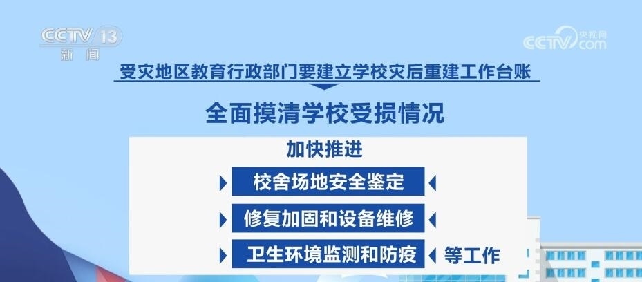 教育部強調(diào),要慎終如始做好災(zāi)后恢復(fù)重建各項工作,穩(wěn)慎做好受災(zāi)師生安置慰問、補償救助等工作。受災(zāi)地區(qū)教育行政部門要建立學(xué)校災(zāi)后重建工作臺賬,全面摸清學(xué)校受損情況,加快推進(jìn)校舍場地安全鑒定、修復(fù)加固和設(shè)備維修、衛(wèi)生環(huán)境監(jiān)測和防疫等工作。確實在開學(xué)前不能完成災(zāi)后重建的,要立足實際采取臨時轉(zhuǎn)移就學(xué)等舉措,全力保障正常開學(xué)。各地各校要一體推進(jìn)防汛救災(zāi)和校園安全治理,健全校園安全常規(guī)檢查機制,持續(xù)深入排查整治風(fēng)險隱患,有效防范原發(fā)、誘發(fā)性自然災(zāi)害和次生安全風(fēng)險。