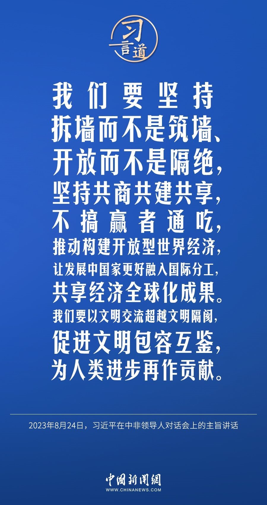 當(dāng)?shù)貢r(shí)間8月24日晚,國(guó)家主席習(xí)近平和南非總統(tǒng)拉馬福薩在約翰內(nèi)斯堡共同主持中非領(lǐng)導(dǎo)人對(duì)話會(huì)。習(xí)近平發(fā)表題為《攜手推進(jìn)現(xiàn)代化事業(yè) 共創(chuàng)中非美好未來(lái)》的主旨講話。習(xí)近平指出——