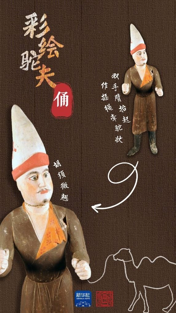 吐魯番阿斯塔那206號(hào)墓是唐代高昌左衛(wèi)大將軍張雄與妻子的合葬墓。墓中出土的木俑做工精湛,大多是由中原生產(chǎn),具有明顯的盛唐風(fēng)格,彩繪駝夫俑便出土于此。駝夫?yàn)楹四凶有蜗螅钅扛弑?,胡須微翹,頭戴高聳折沿白氈尖帽,身著褐色掩襟長袍,足穿高棱黑靴。此俑為分段雕刻膠合而成,再施以彩繪,面部表情富有神韻,惟妙惟肖。通過駝夫生動(dòng)的神情仿佛看到他牽著駱駝,帶著各色商品,沿著絲綢之路慢慢走來。