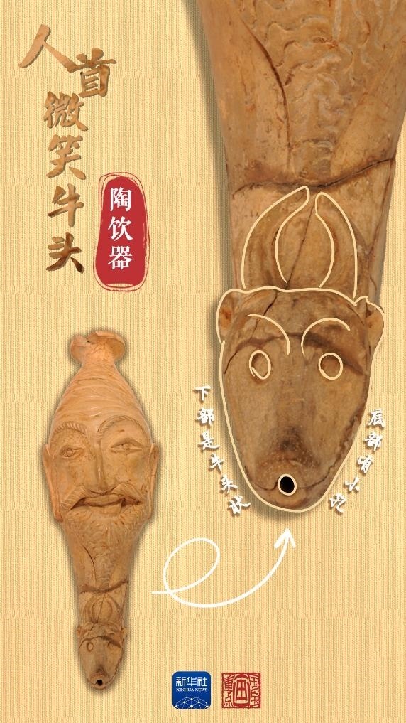 當(dāng)中國絲綢的美譽(yù)經(jīng)由古絲綢之路在西亞、歐洲等地傳揚(yáng)時(shí),西方文明也穿過風(fēng)沙與長歌,在中國留下了印記。人首微笑牛頭陶飲器出土于和田地區(qū)約特干遺址,為唐代時(shí)期文物。飲器上部為人首形,下部是牛頭狀,底部帶小圓孔,上下兩部分內(nèi)腔相通。人首上唇胡須外展卷翹,面帶微笑。牛頭微微上翹,牛角豎立攏圓。這種飲器造型源自“來通”,即末端為動(dòng)物形或人首形的角杯,是小亞細(xì)亞和地中海地區(qū)常見的飲酒器具,絲綢之路沿線國家都有類似文物出土。